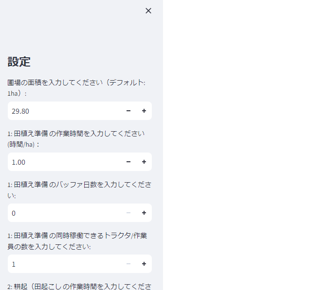 - 作業時間: それぞれのタスクにかかる時間を時間/ヘクタールで入力します。
