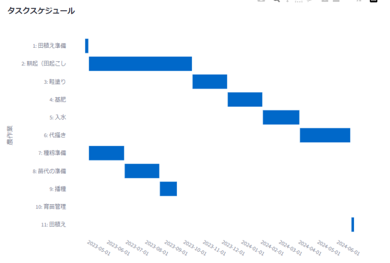 「稲作スケジュール作成Webアプリ」にはガントチャート表示機能が搭載されています。この機能を利用することで、スケジュールの全体像を一目で確認することができるのです。具体的な作業内容や日程だけでなく、各作業間の関係性や進行度なども視覚的に把握することができます。