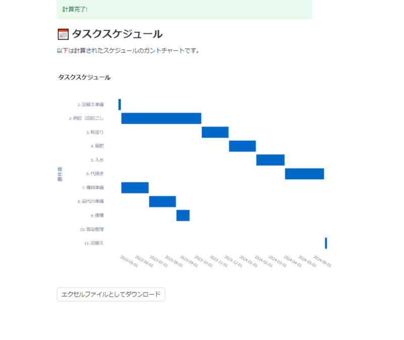 - 目的: 計算されたスケジュールを時系列で視覚的に表示し、全体の流れや各作業の関連性を一目で確認することができます。