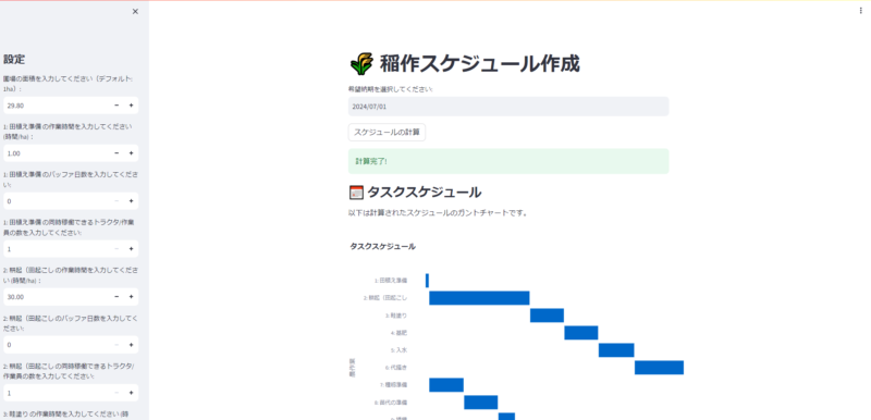 稲作スケジュール作成Webアプリは、非常にシンプルで直感的なUIを採用していますが、その背後には高度な計算ロジックが動作しています。以下に、アプリの主な機能とその使い方を詳細に説明します。