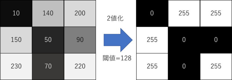 具体的に下図を例に説明していきます。下右図のような値を持っている画像に対して閾値128を設けます。そうすると、128以上の値を持つ画素が255に、128より小さい値を持つ画素を0に変換することができます。